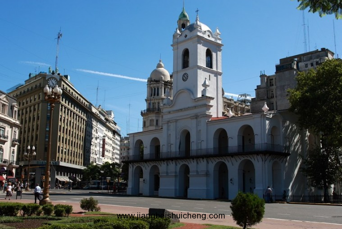 阿根廷國會大廈位于國會廣場西端,是阿根廷的立法機關,大廈于1887年至1906年建成。大廈主體有4層,以白色大理石裝飾墻面,帶雕飾的希臘式立柱環(huán)繞整個建筑。大廈正中高高聳起一座穹頂塔樓,塔身半腰處,一輛青銅四架馬車凌空欲飛,最高處是直徑20米的青銅穹頂。建筑的氣勢與精美,不輸于華盛頓的國會大廈。屹立在大廈前面的兩會紀念碑氣勢宏偉,工藝精美。