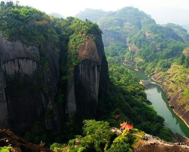 幔亭峰橫欹在大王峰北側(cè),其麓相連,高不及大王峰。峰頂?shù)貏萜教梗幸黄奘?,狀如香鼎,叫做宴仙壇。相傳當年武夷君曾在此設幔亭宴會鄉(xiāng)人,“幔亭”之名即由此而來。據(jù)宋祝穆《武夷山記》載:秦始皇二年八月十五日,武夷君與皇太姥、魏王子騫等十三仙人,在又平又寬的峰頂張幔為亭,結(jié)彩為屋數(shù)百間,大宴鄉(xiāng)人。應召而來的男女二千多人,循虹橋魚貫而上,到了峰頂,幔亭、彩屋鋪著紅云茵、紫霞褥,金宇綴花,馨香氤氳;鼓樂齊鳴,歌聲嘹亮;席間食品全非人世間所有。這個幔亭招宴的故事,流傳千年,至今不衰。幔亭峰丹崖峻拔,蒼松環(huán)簇,好似一座巨大的翠屏,南宋辛棄疾有詩道:“山上風吹笙鶴聲,山前人望翠云屏。蓬萊枉覓瑤池路,版權(quán)所有山東聊城聊之旅國際旅行社有限公司,轉(zhuǎn)載必究!不道人間有幔亭?!辩澰卺Mし鍠|壁的“幔亭”二字,大四方丈,為明吳思學所書。峰的半腰有一片巨石,渾然方正,上大下小,約莫可坐數(shù)十人,俗名“棋盤石”。相傳當年漢武帝派遣使者來武夷山,是在這里用乾魚祀武夷君的,所以又稱漢祀壇。司馬遷《史記》上都有記載。