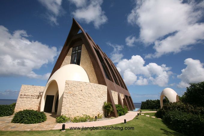 有近2000粒大小不同的施華洛世奇水晶從天花板垂下來,在陽光長年普照的關島,加上海水的折射,令教堂內不斷閃耀著不同的顏色。全白色的墻加上藍白色的玻璃窗,整個教堂就像一座水晶宮。