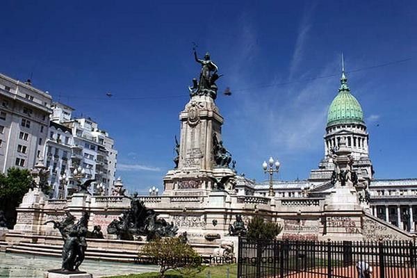 大廈前屹立著氣勢宏偉,造型別致精美的兩會紀念碑。紀念碑底座是一個寬闊的花崗巖平臺,四個角上雄踞著展翅欲飛的銅塑雄鷹,紀念碑頂上站立著一尊代表共和國的婦女銅像,她右手持象征勝利的月桂枝,左手扶犁代表勞動,腳下踏著一條毒蛇,表示懲戒邪惡。版權(quán)所有山東聊城聊之旅國際旅行社有限公司,轉(zhuǎn)載必究!紀念碑的中部兩側(cè),各有一個婦女雕像,一個高舉掙斷了的鐵鏈,象征1813年大會,另一手拿國旗、國徽,象征1816年議會。緊靠紀念碑底座前邊有一座音樂噴泉?;◢弾r的水池周圍,有一組生動的銅雕。一個男青年腰圍飄逸的布裙,象征著奔流的拉普拉塔河水,他身邊兩位捧罐倒水的婦女則代表拉普拉塔河的兩個支流,在他們前面有四匹駿馬好似從水中騰躍而起,馬口也是噴泉的出水口,此外還有造型逼真的蜥蜴、水蛇等拉普拉塔河流域的動物。音樂聲起,水柱騰空,隨著節(jié)拍搖弋起舞。夜晚配以變幻的燈光,場面更加迷人。