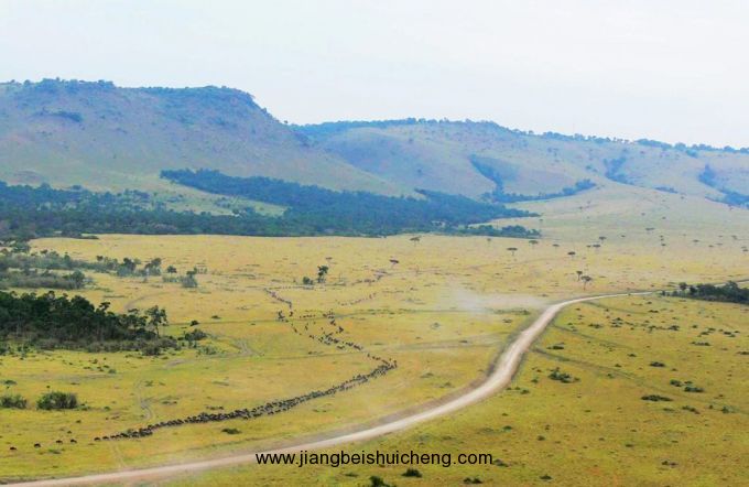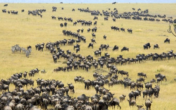 在塞倫蓋蒂草原上發(fā)生的一年一度的動(dòng)物大遷徙是這個(gè)世界上最偉大的自然景觀,動(dòng)物們靠遷徙的方式找尋水源和牧草。從空中俯瞰,遷徙的場(chǎng)面尤為壯觀--每年大約有150萬(wàn)只牛羚和斑馬會(huì)在塞倫蓋蒂大范圍地巡游一周,它們就像一個(gè)巨大的隆隆作響的割草機(jī)在草原上一掃而過(guò),還給大地的是平均每天450噸的糞便。除了牛羚和斑馬是這個(gè)舞臺(tái)的主角以外,走在這條遷徙路上的還有約30萬(wàn)只湯姆森瞪羚和3萬(wàn)只格蘭特瞪羚。不斷壯大的遷徙隊(duì)伍形成了一個(gè)觸目驚心的浩浩蕩蕩的獸群。