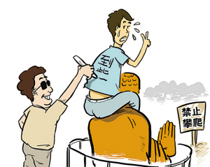 第二例,陜西李文春攀爬紅軍雕塑照相案。照片被微信傳出后,引起公眾的譴責(zé)。國家旅游局立即進行督辦,陜西省旅游局已將李文春已并列入“游客不文明行為記錄”。吳起縣勝利山景區(qū)因管理不嚴(yán),被取消年度評先評優(yōu)資格。國家旅游局研究決定:⑴將李文春列入“全國游客不文明行為記錄”,期限10年;⑵吳起縣勝利山景區(qū)因管理不善,兩年內(nèi)不得參評A級景區(qū)。
