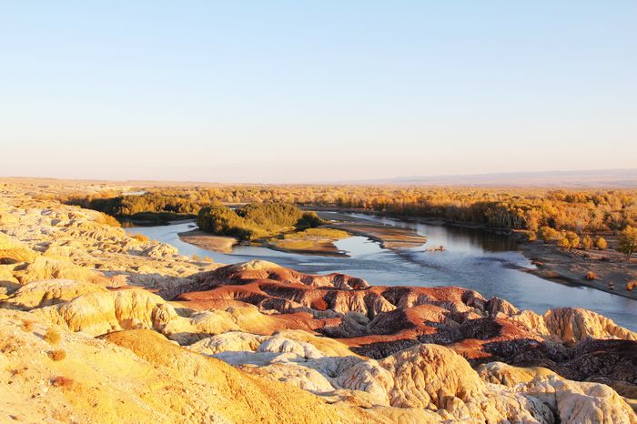五彩灘位于阿勒泰地區(qū)布爾津縣境內(nèi),額爾齊斯河北岸,它是懸崖式的雅丹地貌,山勢起伏、顏色多變,這里的巖石以紅色為主,間以綠、黃、白、黑及過渡色彩,在不同光線照耀下,更加色彩斑斕、嬌艷嫵媚, 一般的雅丹地貌周圍都是戈壁荒漠景觀,但五彩灘的奇妙和非凡之處在于,它處在美麗的額爾齊斯河谷里,河對面是一片郁郁蔥蔥的綠洲,截然不同的地貌,就這樣唇齒相依般依偎在一起,一河隔兩岸,儼然兩重天,對比強(qiáng)烈又渾然天成。因此五彩灘被稱作新疆最美的丹雅景觀。