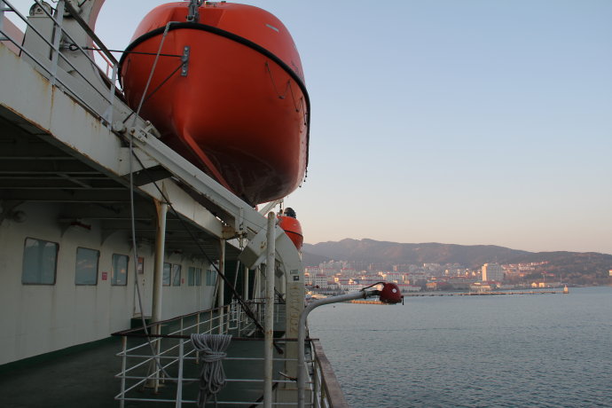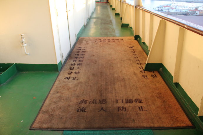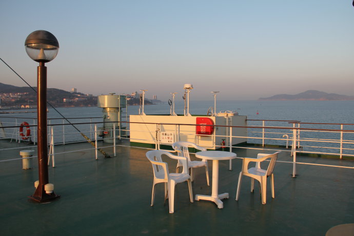看,這艘船的甲板上,既有提醒游客的熱心性。還為甲板上增添了一道亮麗的風(fēng)景線,而翻譯成的韓文,就足以說明了威海碼頭的國際性。