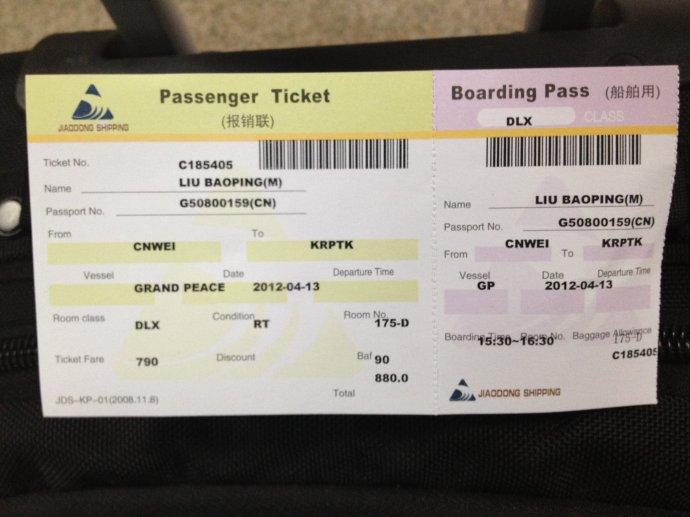 看,這是我們赴韓國的船票,大家可以看看,相信以后會用到的,嘻嘻。
