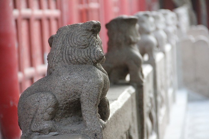 大雄寶殿重檐斗拱,雕梁畫揀,金碧交輝,其內(nèi)供奉有釋迦摩尼、阿彌陀佛和藥師佛三世佛,均高一丈三尺,其后是大型雕塑海島觀音,取材于《華嚴(yán)經(jīng)》善財童子53參的故事,形象地表現(xiàn)出南海觀音普渡眾生的場面,東西兩壁供奉的是十八羅漢。
