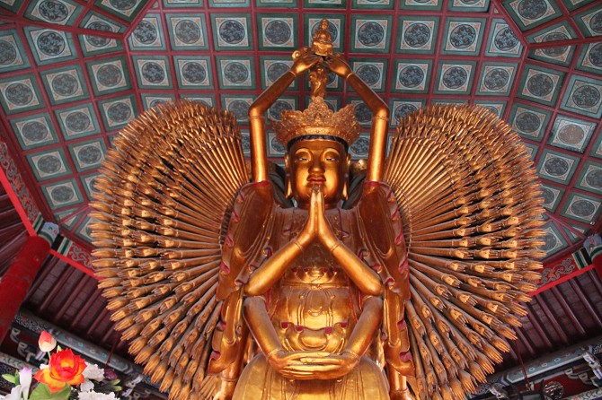 羅漢殿中間,有一木結(jié)構(gòu)八角亭高高聳立,內(nèi)有一尊四面千手千眼觀音木雕像,高6.6米,獨一無二,是在乾隆年間,由藝術(shù)巨匠用一株白果樹雕刻而成,這名巨匠大約在28歲時開工,在80多歲時才完工,傾注了自己的全部。