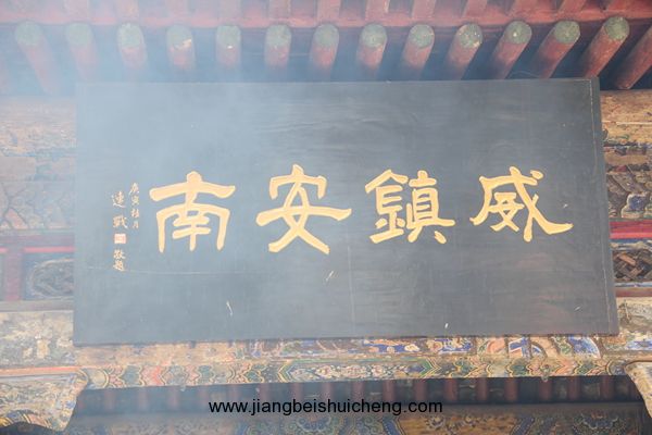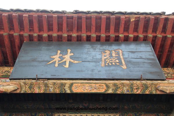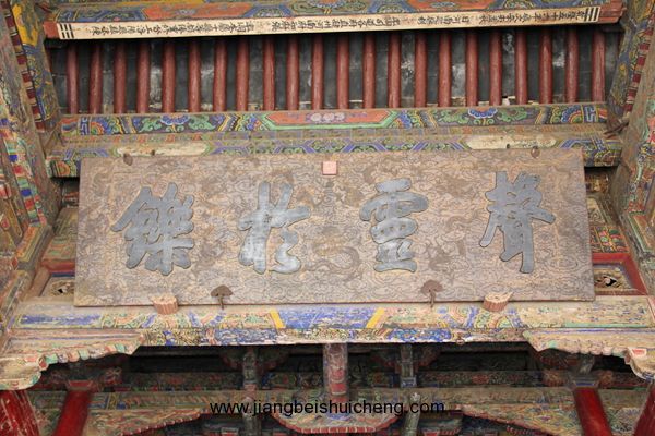 仰面觀之,有一塊大匾高高懸在大門上,上書“聲靈于鑠”四個大字,寓意關(guān)公美好的聲名象美好的音樂一樣傳揚四方。這塊匾是清乾隆十五年乾隆帝所題,同時兩側(cè)并題有聯(lián)曰:“翊漢表神功龍門并峻,扶綱伸浩氣伊水同流。”由此可以看出,不僅百姓敬仰關(guān)公,古代帝王對關(guān)公也同樣尊崇。