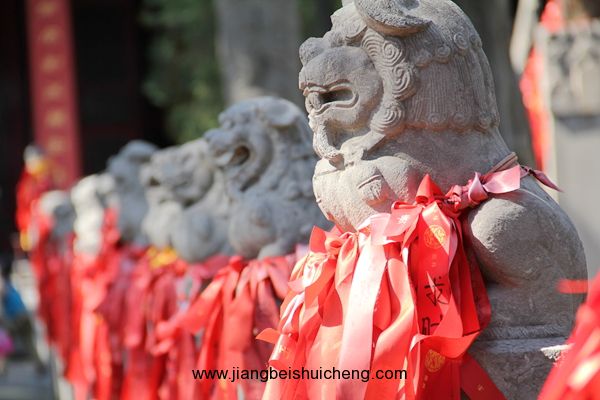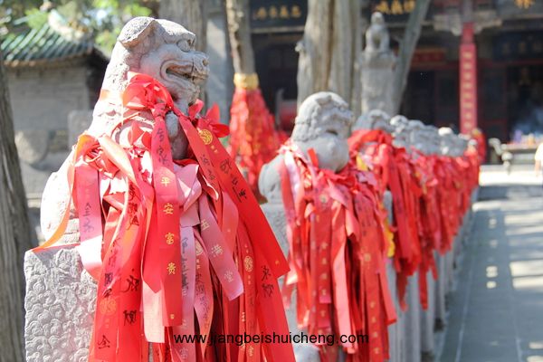穿過儀門,你將看到一條我國關(guān)廟中惟一的石獅甬道。在長約35米的古甬道上,共有大小石獅104尊安坐兩側(cè)甬柱頂上,大獅姿態(tài)安詳,小獅活潑可愛,百獅百態(tài),讓人稱奇。