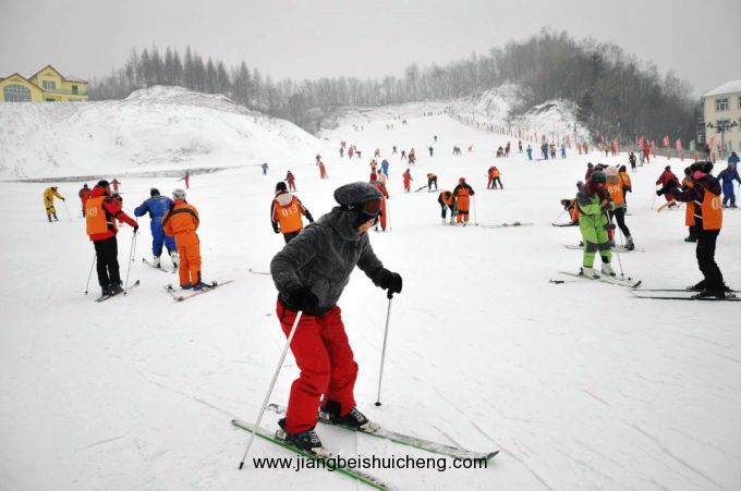 導游很熱情地給我推薦了教練,是一個二十多歲,面相柔和的少年。我也是青春年少,正當年,看著教練有點小帥的臉,頓時浮想聯(lián)翩起來。尤其是當教練幫我穿好一切裝備時,我感覺我的臉好像都紅了一些。唉,滑雪場真是戀愛者的天堂,在這里,一切肢體接觸都是愛的關懷,不但不會挨耳光,運氣好,還會得到女友感激的香吻,真不錯,不錯呀!我還打算繼續(xù)胡思亂想,但是,教練沒有給我機會。他不停地給我講訴著滑雪時應該注意的問題,還囑咐我千萬不要高估自己的能力,貿然行事;也要盡量避免和別人相撞,如果情況緊急,應迅速降低重心,向后坐,不要隨意掙扎。。。一刻鐘后,我終于要開始滑行了。但是雪靴又重又硬,腳穿在里面一點也不可以彎曲,我抱著雪撬、拿著雪杖好不容易才挪到了可以滑雪的好位置。但剛一出腳,就摔了個狗吃屎,教練沒有笑我,輕輕扶我起來,說,開始滑行前,身體要往前傾,雙腳與肩同寬并平行,雙手握住雪杖傾斜著往身后推,先慢慢地在平坡上滑行,找到感覺后,再加速。另外,要停下來時,就把滑雪板成“八”字形,這樣不易摔倒。我按照教練說的,循序漸進,不急不躁地滑動起來,雖然一開始還是會不斷摔倒,但是漸漸地我就掌握住了要領,即使不能快速滑行,也算是可以獨立一人支撐了。我欣喜于自己的進步,為了犒勞自己,便卸下重重的殼,買了一些當?shù)靥禺a,麻辣燙、煎餅什么的,坐在場地邊緣,欣賞起別的滑雪者來。