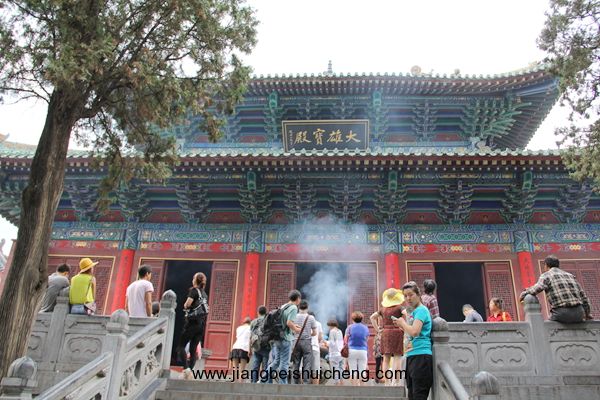穿過(guò)天王殿,其后有大雄寶殿。殿內(nèi)供奉著釋迦牟尼、阿彌陀佛、藥師佛的神像,屏墻后面懸塑觀音像,兩側(cè)有十八羅漢侍立。大雄寶殿之后,又有藏經(jīng)閣藏書(shū)八百萬(wàn)卷,這是寺僧藏經(jīng)說(shuō)法的場(chǎng)所。