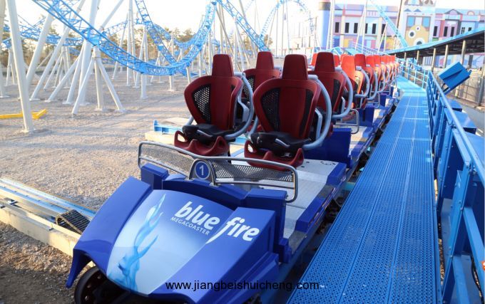 鎮(zhèn)園之寶世界之最——藍火過山車,由德國馬克公司原裝進口,總造價1.2億,全長1098米,至高點38米,最高時速可達100公里,采用火箭發(fā)射式原理,讓游客體驗瞬間離地的超刺激、驚險快感。