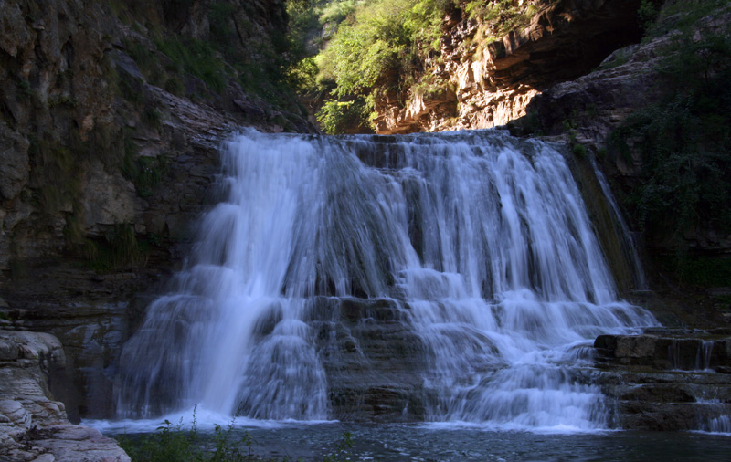 無獨有偶,再行5公里之地,又有一個天生的洗臉盆,面積三分地大,形似滴水盆,圓如規(guī)定徑。水無源,清波蕩漾;盆無蓋,一眼見底。當(dāng)?shù)厝藢⒌嗡枧c洗臉盆稱為筋骨相連的子母盆。過了洗臉盆便是水簾洞。一股兩米寬的泉水從北峽溝的洞中涌出,緩流四五十米后順山崖直壁而下,一派“飛流直下三千尺”的磅礴氣勢。其后一深洞,嘩嘩瀑布落就半崖伸出的青石板上,打著飛快的漩渦卷人洞內(nèi),而后又從洞底端漏口處噴出,驚濤駭浪之聲震山蕩谷。