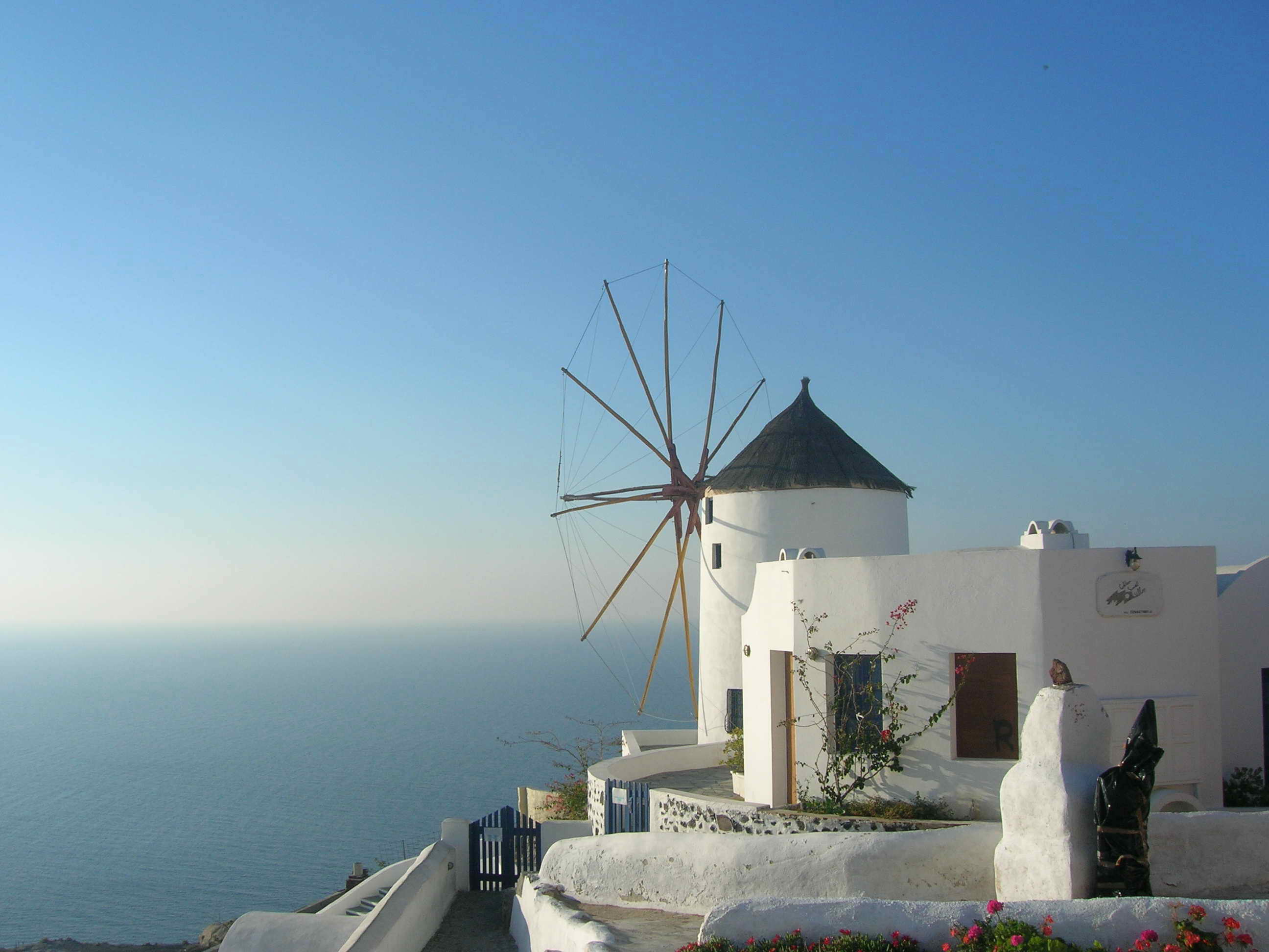 米克諾斯島是希臘南部基克拉澤群島中的一座,也是愛琴海上最享盛名的度假島嶼之一。島上居民很少,每年大約半年的非旅游時(shí)間,島上相當(dāng)安靜。四月以后,旅游季節(jié)開始了,來自世界各地的游客就像候鳥一樣絡(luò)繹不絕地飛來島上,享受地中海的陽(yáng)光和海灘。在島上漫步,看到房頂都是用大石塊壘起的平頂,覺得很奇怪。問了當(dāng)?shù)氐木用窈蟛胖?,島上冬天寒冷,風(fēng)特別大,只有這些結(jié)實(shí)的屋頂才能抵御寒風(fēng)。在島西南面海邊的小山丘上,有5座基克拉澤式的風(fēng)車,這是米克諾斯島的標(biāo)志。