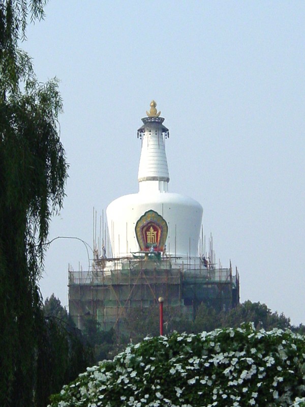 北海白塔—藏傳喇嘛塔 于清初順治八年(1651年),是一座藏式喇嘛塔。據(jù)建塔石碑記載,當(dāng)時"有西域喇嘛者,欲以佛教陰贊皇猷,請立塔寺,壽國佑民",得到皇帝的恩準(zhǔn),于是修建了永安寺和白塔。塔高35.9米,上圓下方,富有變化,為須彌山座式,塔頂設(shè)有寶蓋、寶頂,并裝飾有日、月及火焰花紋,以表示"佛法"象日、月那樣光芒四射,永照大地。塔身正面有一盾形小龕,內(nèi)塑紅底黃字的藏文圖案,含"吉祥如意"之意。此龕俗稱"眼光門",又叫"時輪金剛門"。1679年該塔被地震所毀,次年重建。1976年唐山地震波及北京,塔頂被損。在修復(fù)時,發(fā)現(xiàn)塔內(nèi)主心木中藏有一個二寸見方的金漆盒子,盒蓋繪有太極圖,盒內(nèi)藏有兩"舍利",證明此塔是一座舍利塔。該塔矗立于瓊島頂峰,綠蔭擁簇,巍峨壯美,引人矚目。這種象征神權(quán)的建筑物--白塔和永安寺,設(shè)置于瓊島的重要位置上,具有主宰全園的氣勢,以體現(xiàn)"君權(quán)神授"的封建思想,此是帝王宮苑的一大特色。