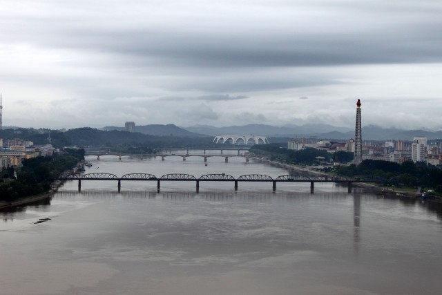 主體思想塔正面,清澈的大同江水潺潺流過,江水中有兩個(gè)大型噴泉,水柱達(dá)150米高,在噴泉的襯托下,主體思想塔更加壯麗、雄偉。可以乘坐高速電梯上至主體思想塔的150米處,俯瞰平壤全景。