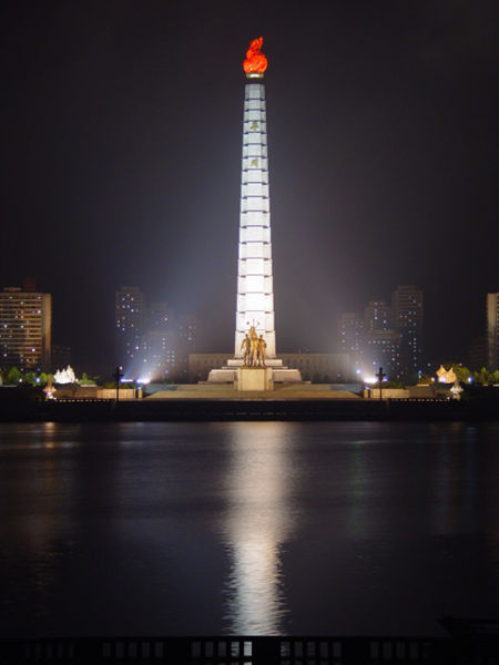 主體思想塔(????? Juche Tower) 位于朝鮮民主主義人民共和國首都平壤市市中心的大同江畔,是為祝賀金日成七十壽辰而建的,塔及其周圍附屬建筑占地總面積15萬平方米。1982年4月15日竣工揭幕。主體思想塔是金日成主席創(chuàng)立的“主體思想”的象征。塔的正面,建有高30米、重33噸的象征工人、農(nóng)民、知識(shí)分子的三人群像,左右是以“主體工業(yè)”、“豐年”、“學(xué)習(xí)之國”、“無病長壽”、“主體藝術(shù)”、“銅墻鐵壁”為主題的花崗巖群像。