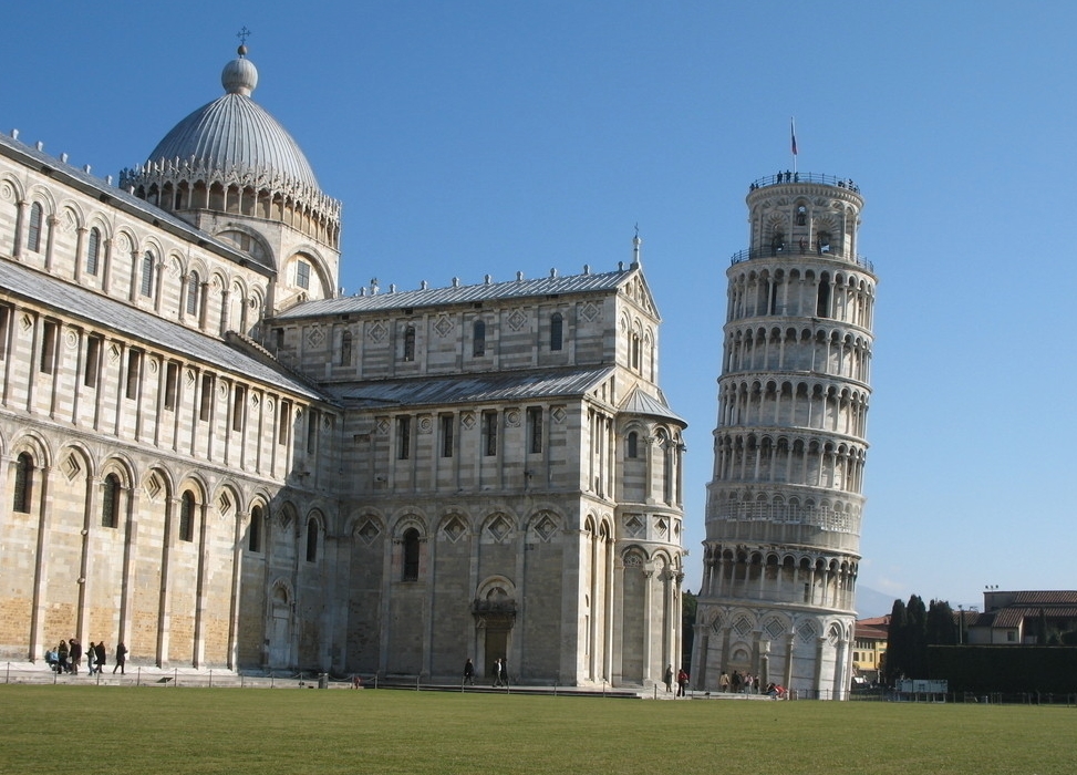 比薩斜塔(意大利語:Torre pendente di Pisa或Torre di Pisa)是意大利比薩城大教堂的獨(dú)立式鐘樓,于意大利托斯卡納省比薩城北面的奇跡廣場(chǎng)上。廣場(chǎng)的大片草坪上散布著一組宗教建筑,它們是大教堂(建造于1063年—13世紀(jì))、洗禮堂(建造于1153年—14世紀(jì))、鐘樓(即比薩斜塔)和墓園(建造于1174年),它們的外墻面均為乳白色大理石砌成,各自相對(duì)獨(dú)立但又形成統(tǒng)一羅馬式建筑風(fēng)格。比薩斜塔位于比薩大教堂的后面。