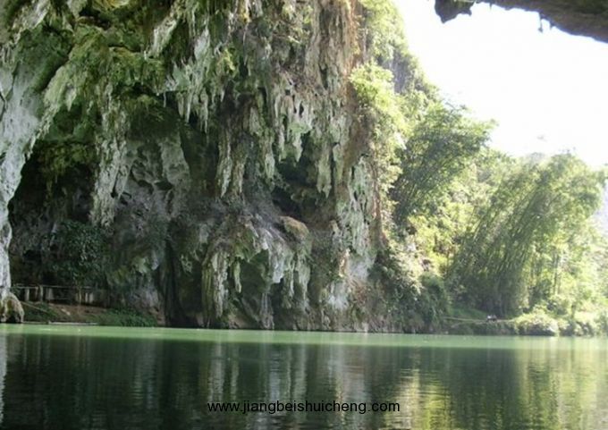 百鳥巖,位于廣西巴馬瑤族自治縣甲篆鄉(xiāng)烈屯西北面的漠齋山下,別名龍虎洞。因洞內(nèi)燕子棲集,蝙蝠掠飛,又名百鳥洞。盤陽河自吉屯白熊洞潛入山下,形成1000多米的伏流暗河后,在此洞流出。洞口寬50米,一石壁把洞口分成兩個(gè)略呈三角形的左右洞口。左側(cè)洞口寬40米,高16米,兩洞口內(nèi)側(cè)相通。洞深500米,蜿蜒曲折,直通與白熊洞一山之隔的拉類坳下的一個(gè)側(cè)洞口。洞中水平如鏡,深不可測(cè),寬處約40米,窄處10米,從洞口行舟至300米轉(zhuǎn)折處,距水面30米處有一圓形天窗,山坳之光照到水面,猶如舞臺(tái)上的光束,色彩紛呈,近右側(cè)洞口處有沙灘,版權(quán)所有山東聊城聊之旅國(guó)際旅行社有限公司,轉(zhuǎn)載必究!可??恐鄞I碁┯覀?cè)是一塊30多平方米的石臺(tái),臺(tái)面深溝淺窩,坑坑坎坎,石臺(tái)一側(cè),洞壁雪白,可攀援其中。有石鷹、石柱、石幔、石觀音菩薩等,百態(tài)千姿,令人目不暇接。石臺(tái)的周圍有仙女梳妝、海螺石,石螺對(duì)面有石桌、石缸和石松果等。側(cè)面洞口外香椿林下野花艷目植被繁衍,把洞口點(diǎn)綴得幽靜雅致。洞中歧洞叉水道不可勝數(shù),密如蜂房,不知所向,整個(gè)洞仿佛一座裝飾華麗、景幻莫測(cè)的水下龍宮。其奇特的景象似桂林蘆笛巖,又因非乘舟不能游覽,游人贈(zèng)予“水上蘆笛巖”的美譽(yù)。