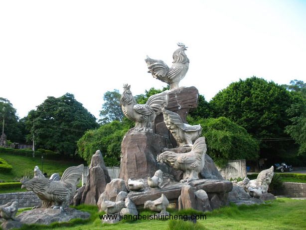 步入公園大門,一組大型的“金雞報(bào)曉”群雕呈現(xiàn)在眼前。群雕高達(dá)8米,19只形態(tài)各異、惟妙惟肖、生動逼真的雞站立在假山上。有的翹首引吭長鳴,有的雄風(fēng)抖擻競相爭斗,有的母愛深深呵護(hù)著小雞……它們極好地體現(xiàn)了整座公園的主題和特色,成了公園的標(biāo)志。版權(quán)所有,山東聊城聊之旅國際旅行社有限公司,轉(zhuǎn)載必究!群雕的背后屏風(fēng)是一座高3米、長15米的弧形青石浮雕照壁,題為“原野牧歌”。壁上展現(xiàn)出一片古樸、淡雅的田園風(fēng)光:山莊的疏籬茅舍,淙淙流水,茂密的林木點(diǎn)綴其間;轉(zhuǎn)運(yùn)的水車和勞作的農(nóng)夫重現(xiàn)遠(yuǎn)逝的故事。整座浮雕宛如一首優(yōu)美的田園山水贊美詩,使人耳目一新,心胸開闊。