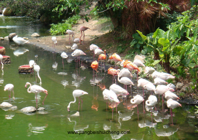 百鳥居設(shè)計獨(dú)特,一個由5條巨柱支撐的巨型不銹鋼絲網(wǎng),罩著面積達(dá)2500平方米的空間。內(nèi)分4區(qū):地棲鳥類區(qū)、森林鳥類區(qū)、叢林鳥類區(qū)及水禽鳥類區(qū),共有鳥3000余只。