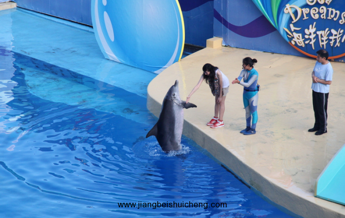 重頭戲——海洋劇場3:30開幕。前來觀看的游客一般會(huì)非常多,盡量提前半小時(shí)去,能坐陽光爆曬的座位。節(jié)目內(nèi)容很多,兩只海獅招手、倒立、揮手、拿救生圈救人、對(duì)“落水者”進(jìn)行人工呼吸……不知道與海獅kiss是啥味道。五只海豚則表演游泳比賽、跳高觸球、跨藍(lán)、空中翻身36周半、直立旋轉(zhuǎn)、仰泳等,真的是很有靈性。最讓我驚嘆的是那些團(tuán)體動(dòng)作,竟也能做得那樣整齊劃一,有板有眼。