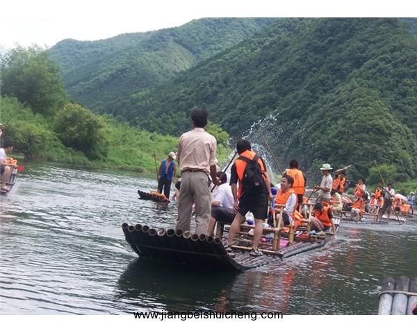 “江南第一漂”位于徽水河流經(jīng)涇縣的最后一段,上起烏溪鄉(xiāng)姚村,下止黃村鄉(xiāng),景區(qū)全長約20公里。景區(qū)內(nèi)河道蜿蜒曲折,水流湍急,兩岸層巒疊翠風(fēng)光綺麗,是休閑旅游的好去處?;账悠魍窘?jīng)五大景區(qū):起筏地叫龍?zhí)叮瑸╅L浪急,游人在竹筏上隨浪俯仰,跌宕穿梭,一種戰(zhàn)勝大自然的酣暢淋漓之感油然而生。接下來是“早霧山”景區(qū)。這里終日云霧繚繞,而水平浪穩(wěn),版權(quán)所有,山東聊城聊之旅國際旅行社有限公司,轉(zhuǎn)載必究!使游人跌宕之心轉(zhuǎn)而為柔情愜意。早霧山下端河道突轉(zhuǎn)急彎,形成“刁潭”,岸邊巨石上的“潭古印”,版權(quán)所有,山東聊城聊之旅國際旅行有限公司轉(zhuǎn)載必究!形象地記錄了昔日放筏工艱難的歲月。這里不知有多少放筏工誤落水中,而落水者卻浮而不沉,因而留下了“刁潭不刁”的神奇?zhèn)髡f。而“胡老灣沖浪”則更是一彎三折,灘中有垅、垅中有灘,千余米的河道落花流水差一米多,游人最能體現(xiàn)“兩岸猿聲啼不住,輕舟已過萬重山”的古詩意境。急灘甫過,柳暗花明又一村——溪西山到了,這里山高水秀,常有云霧繚繞,村舍依山俯傍水而筑,是道地的農(nóng)家風(fēng)光。沿流停筏,小扣柴扉,你能喝到頂級的綠茶“溪西山毛峰”。接下來便到了五雀嶺景區(qū),這里有雞公石、馬影石、木魚墩、百畝草坪、高灘晚釣、斷橋綠水等景點,人稱“江南小漓江”。