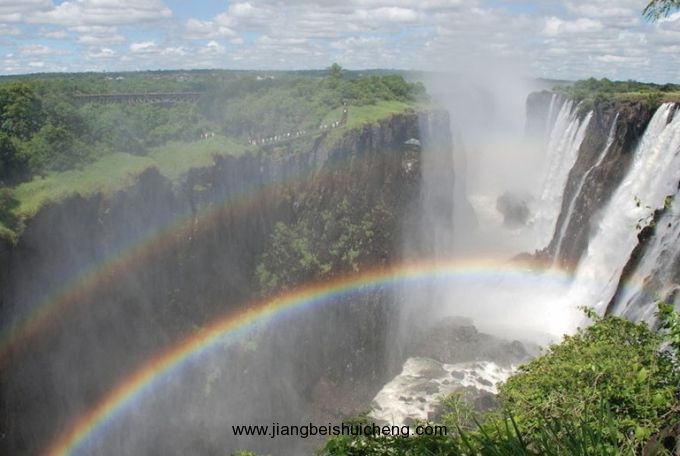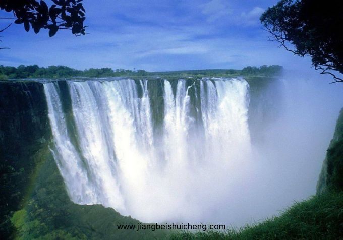 觀賞大瀑布,從盧薩卡出發(fā),可以駕車或乘飛機(jī)去。乘游艇暢游大瀑布的上游——贊比西河。從上游可以看到瀑布的輪廓。贊比西河是非洲第四長河,流向從西向東,南岸是津巴布韋,北岸是贊比亞。河面很寬,但水流平緩。河中有一小島,用望遠(yuǎn)鏡可看到島上徜徉的一群群大象。突然聽到隆隆的響聲,顯然是游艇已接近瀑布。在盛水期,你從幾里甚至幾十里開外,就能看到瀑布激起的沖天水柱,一團(tuán)團(tuán)不斷向上翻涌,在藍(lán)天白云間飄散開去。當(dāng)?shù)胤Q該瀑布為“莫西奧圖尼亞”,意思是“雷鳴之煙”。維多利亞瀑布最寬處達(dá)1690米。河流跌落處的懸崖對(duì)面又是一道懸崖,兩者相隔僅75米。水在這里形成一個(gè)名為“沸騰鍋”的巨大旋渦,然后順著72千米長的峽谷流去。