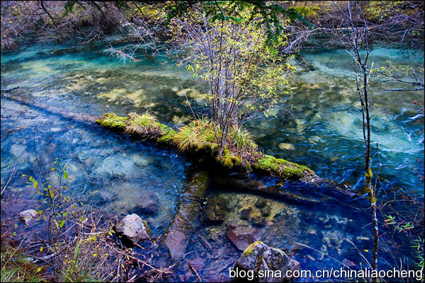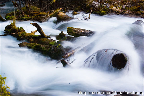 水是萬物之源,只要有水映襯的景色都會(huì)顯得靈動(dòng)。在拍攝水景的照片時(shí),可以尋找環(huán)境中與之相匹配的景色,如岸邊的奇石或淺灘,水中長(zhǎng)滿苔蘚的石頭,或者在水流中飄逸的水草。這張?jiān)谒拇ň耪瘻吓臄z的水景照片,就成功借助了水中童話般的色彩,配上漂浮的樹干,為整個(gè)水景增添了無限的生機(jī)。水景小品的拍攝要主次有別,畫面中不要納入太多的主體,不過這并不是指不能納入太多的元素,而是說各個(gè)元素要在形式或色彩上有一定的統(tǒng)一性,這樣照片組合起來才不會(huì)顯得雜亂無序。