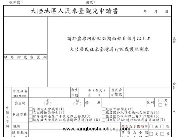 4)填寫完整的《北京市居民往來臺灣地區(qū)申請表》(出入境管理處提供)