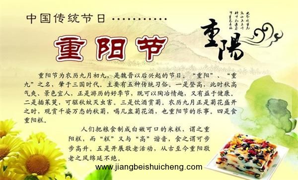 重陽節(jié),又稱“踏秋”,每年農(nóng)歷九月初九日,為中國(guó)傳統(tǒng)四大祭祖的節(jié)日 。重陽節(jié)早在戰(zhàn)國(guó)時(shí)期就已經(jīng)形成,到了唐代,重陽被正式定為民間的節(jié)日,此后歷朝歷代沿襲至今。重陽與三月初三日“踏春”皆是家族傾室而出,重陽這天所有親人都要一起登高“避災(zāi)”,插茱萸、賞菊花。