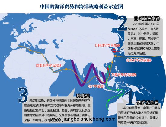 印度洋是中國重要的國際貿(mào)易通道和能源通道。首先是能源安全。自1993年中國成為石油凈進口國,截至2009年,中國已成為僅次于美國和日本的第三大石油進口國,進口量超過2億噸,日均超過380萬桶,已占整個石油需求量的60%,未來的需求量還會繼續(xù)攀升,而國內(nèi)產(chǎn)量到2020年將開始下降。據(jù)羅伯特。卡普蘭估計,到2020年中國的石油需求量將達到日均730萬桶。目前中國石油進口量的80%來自中東和非洲,經(jīng)印度洋和馬六甲海峽等通道運至中國。雖然中國也在積極爭取石油進口多元化,但原油儲量占世界60%、天然氣儲量占世界35%的印度洋地區(qū)仍是中國最可靠的石油進口地區(qū),到2020年超過85%的石油進口量要走印度洋航線,印度洋和馬六甲海峽地區(qū)的安全影響著這條事關(guān)中國經(jīng)濟命脈的“海上生命線”,因此被稱為中國的“馬六甲困局”。由于中國奉行和平發(fā)展戰(zhàn)略及限于自己的海軍力量,在非和平時期,中國對保障這條“海上生命線”還存在很大的困難。據(jù)統(tǒng)計,中國現(xiàn)在的戰(zhàn)略石油儲備量不足30天,而國際能源署建議的儲備標準是90天,美國和日本等國的儲備量超過160天,其他發(fā)達大國也遠超90天。一旦爆發(fā)危機,中國就有可能受制于人。同時,印度洋地區(qū)沿岸國家大都屬于礦產(chǎn)資源豐富的欠發(fā)達國家,由于技術(shù)和資金短缺,這些礦產(chǎn)資源基本上屬于未開發(fā)、半開發(fā)或開發(fā)水平不高的狀態(tài)。隨著中國國內(nèi)資源的日益枯竭,印度洋地區(qū)的各種礦產(chǎn)資源,如銅、鋰、鈹、鎳、鈷及磷酸鹽等都是中國現(xiàn)在或未來所需的,因此中國有必要與這些國家合作以保證印度洋航線的安全。