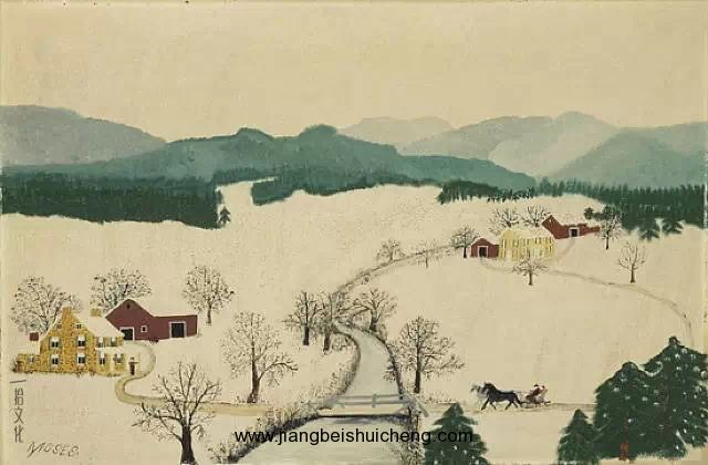 有人問(wèn),你為什么在年老時(shí)選擇了繪畫(huà),是認(rèn)為自己在畫(huà)畫(huà)方面有成功的可能嗎?我的生活圈從未離開(kāi)過(guò)農(nóng)場(chǎng),曾是個(gè)從未見(jiàn)過(guò)大世面的貧窮農(nóng)夫的女兒、農(nóng)場(chǎng)工人的妻子。在繪畫(huà)前,我以刺繡為主業(yè),后因關(guān)節(jié)炎不得不放棄刺繡,拿起畫(huà)筆開(kāi)始繪畫(huà)。假如我不繪畫(huà)的話(huà),興許我會(huì)養(yǎng)雞。