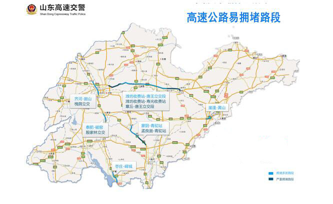 此外,山東省內(nèi)高速公路可能出現(xiàn)的堵點有: G20青銀高速濰坊收費站-唐王立交段K150-K330,重點擁堵多發(fā)路段為濰坊收費站-壽光收費站K150-K180,章丘-唐王立交段K300-K330;G2京滬高速蒙陰K551-青駝站K530-K590,重點擁堵多發(fā)路段為孟良崮(K578)-青駝站K560-K590;G22青蘭高速崖逢-黃山K60-K75;G3京臺高速齊河-崮山K380-K410,泰肥-磁窯K470-K500, 棗莊-嶧城K620-K650;G2001濟南繞城高速殷家林立交、槐蔭立交附近路段。