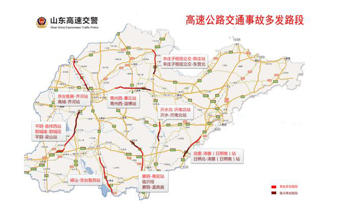 通過對2012、2013、2014、2015年事故多發(fā)道路統(tǒng)計分析,預測2016年國慶節(jié)事故主要集中在G20青銀高速青州西-章丘站K210-K300,重點事故多發(fā)路段為青州西-淄博站K210-K240;G3京臺高速京臺魯冀-齊河站K300-K390和嶧山-京臺魯蘇站K570-K660,重點事故多發(fā)路段為禹城-齊河站K360-K390;G18榮烏高速辛莊子樞紐立交-陳莊站K450-K510,重點事故多發(fā)路段為辛莊子樞紐立交-東營北K450-K480。G15沈海高速泊里-濤雒(日照南)站K680-K740,重點事故多發(fā)路段為日照北-濤雒(日照南)站K710-K740。G35濟廣高速平陰-嘉祥西站K100-K190,鄆城南-鄆城段K212-K232,重點事故多發(fā)路段為平陰-梁山站K100-K160;G2京滬高速蒙陰-青駝站K540-K600,臨沂段K610-K638,重點事故多發(fā)路段為蒙陰-孟良崮K540-K570;G25長深高速沂水北(K1507 )—沂南北站K1490-K1550,重點事故多發(fā)路段為沂水-沂南北站K1520-K1550。