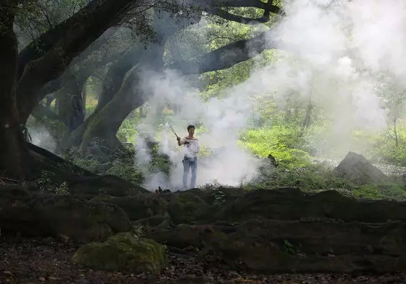 靜靜地等待一會兒,太陽出來了,拍攝時機(jī)成熟。老王開始招呼他的助理——另外兩個村民,在榕樹后面開始放煙餅。