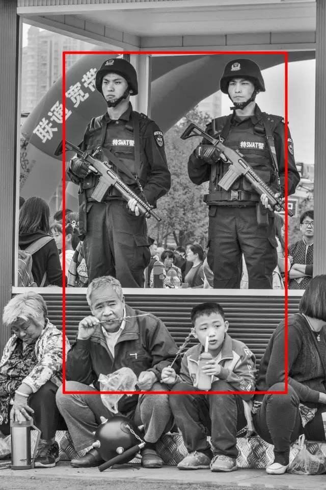 點(diǎn)評(píng):特警的堅(jiān)守,百姓在警察的身邊安詳生活,表達(dá)的主題很好。不過(guò),左邊警察頭部與廣告語(yǔ)重疊,影響視覺(jué)中心,拍攝時(shí)應(yīng)注意隱蔽掉廣告。