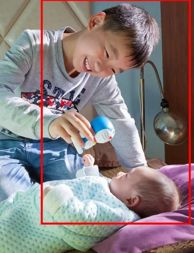 點(diǎn)評(píng):一大一小、一臥一坐、一動(dòng)一靜形成對(duì)比,反射光作為補(bǔ)光打到哥哥臉上,使畫(huà)面很生動(dòng)。但整個(gè)畫(huà)面構(gòu)圖隨意,如果想突出哥哥,可以稍作裁剪。