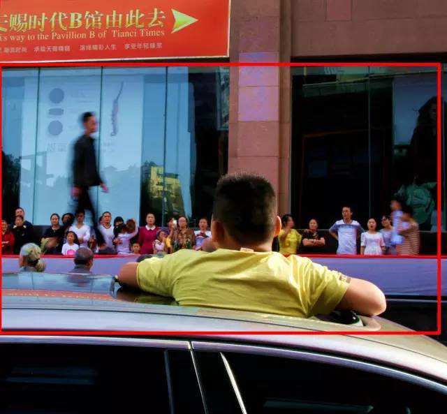 點(diǎn)評(píng):T臺(tái)表演者的虛化,靜止清晰的男孩,慢速拍攝能更好地表現(xiàn)虛實(shí)、動(dòng)靜的對(duì)比。但是,作者采取正方形的構(gòu)圖不妥,左上角的紅色廣告牌有些搶?xiě)?,下部的?chē)窗影響視線。剪裁后,畫(huà)面更簡(jiǎn)潔明了。