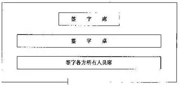 一般簽字桌橫放。簽字者面門(mén)而坐,賓右主左。參加者列隊(duì)站在簽字者之后。中央高于兩側(cè),右側(cè)高于左側(cè)。