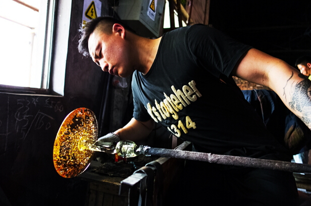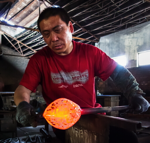 全程拍攝大爐琉璃制作,博山是琉璃之鄉(xiāng),保留傳承了琉璃加工的傳統(tǒng)技藝,并在此基礎(chǔ)上又自己的開(kāi)拓創(chuàng)新。琉璃的制作工藝相當(dāng)復(fù)雜,火里來(lái)、水里去,要幾十道工序才能完成,古法琉璃的精品制作,相當(dāng)費(fèi)時(shí),有的光制作過(guò)程就要十幾二十天,而且主要依靠手工制作。八卦爐,爐里的溫度在1400-1600度,工作車(chē)間內(nèi)的溫度能達(dá)到50攝氏度左右。還有傳說(shuō)琉璃是一個(gè)叫路申的博山人在用八卦爐煉丹的時(shí)候偶然發(fā)現(xiàn)的,觀其在經(jīng)過(guò)烈火煅燒之后還可以晶瑩剔透,遂以長(zhǎng)生不老之丹為名進(jìn)獻(xiàn)給當(dāng)時(shí)的國(guó)君,并置于朝堂以消滅災(zāi)禍。所以佩戴琉璃小飾品還有去災(zāi)避禍的用處。大師提取原料吹制的過(guò)程,都是大師們用空心的管根據(jù)顏色的需要從爐口中提取,然后用空心管吹制。在吹制的過(guò)程中,溫度就會(huì)下降,然后再上回溫爐進(jìn)行加工。