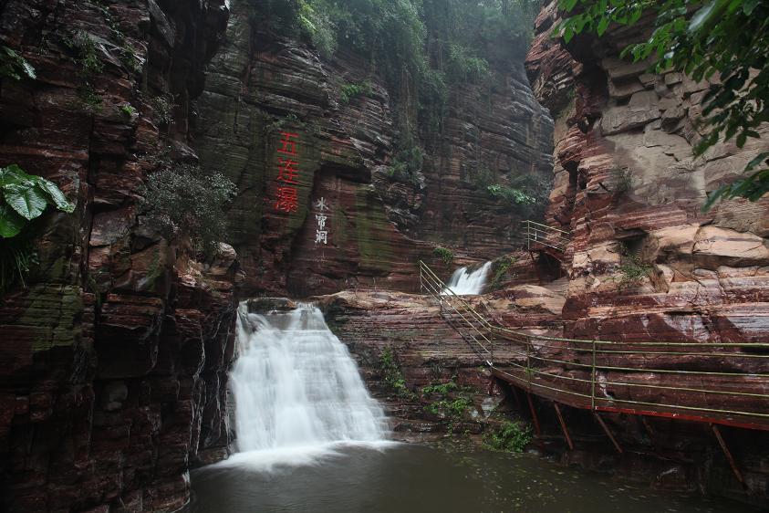 五連瀑水從西南峽谷中流出,形成五級(jí)連環(huán)瀑布。五連瀑的瀑布下有洞,人稱遇仙洞。傳說東漢永平年間劉晨和阮肇就是從這里被仙女接引到洞中的。
