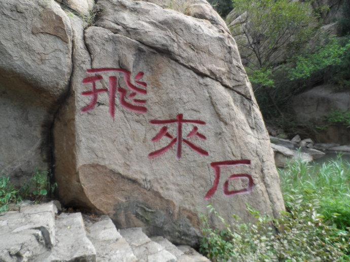 上個世紀 70年夏季的一個中午,一聲響雷過后,左側(cè)山崖上方40米處的一塊巨石被震落下來,落于山澗之中,稱為飛來石。