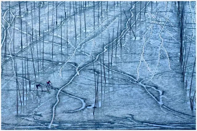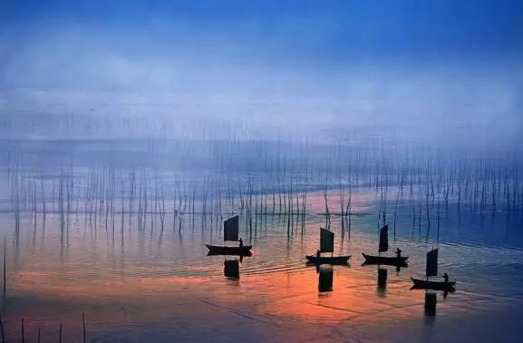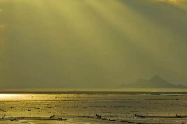 霞浦灘涂上以大面積的灰色為主,上面用于養(yǎng)殖的竹竿反光極為強(qiáng)烈,為了突出光影的效果,這些反光只能駕馭無法消除??梢钥紤]拍攝減少曝光量來進(jìn)行控制畫面的主體明度,達(dá)到增強(qiáng)光影效果的目的。選擇日落日出時段拍攝,化不利為有利。此時竹竿上的光比小,色溫暖,竹竿被夕陽染成了金色,為灘涂風(fēng)光造景造勢。曝光控制值要講究,如果對高光部位正確曝光,舍去暗部的細(xì)節(jié),得考慮到灘涂的竹竿在遠(yuǎn)處成像后非常細(xì)小,即使使用相機(jī)的點測光也無法測出高光部分的亮度,那 么只能使用評價測光來測量。曝光補(bǔ)償上減少2檔曝光。
