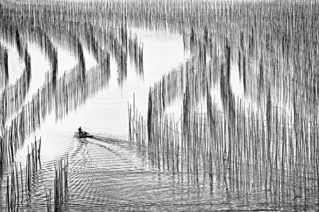 去霞浦拍攝時,不一定會遇到好的天氣,遇到陰天時是不是就不拍照了呢? 陰天依然可以捕捉灘涂美景,不過需要把拍攝模式轉(zhuǎn)為黑白,主要表現(xiàn)灘涂中的漁網(wǎng)漁船等物體的線條,與海水形成黑白剪影的效果。