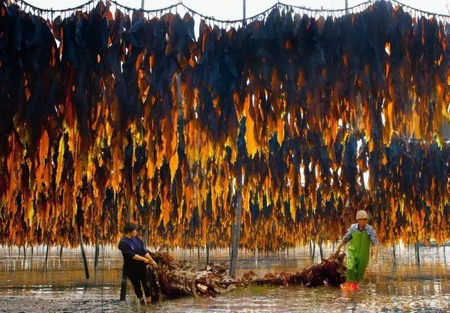 還有曬海帶,適合用中焦進(jìn)行近景拍攝,這樣能夠體現(xiàn)出曬海帶的過程,和曬海帶的壯觀景象,并可以在日落前運(yùn)用逆光拍攝,逆光可以表現(xiàn)出海帶的通透質(zhì)感。