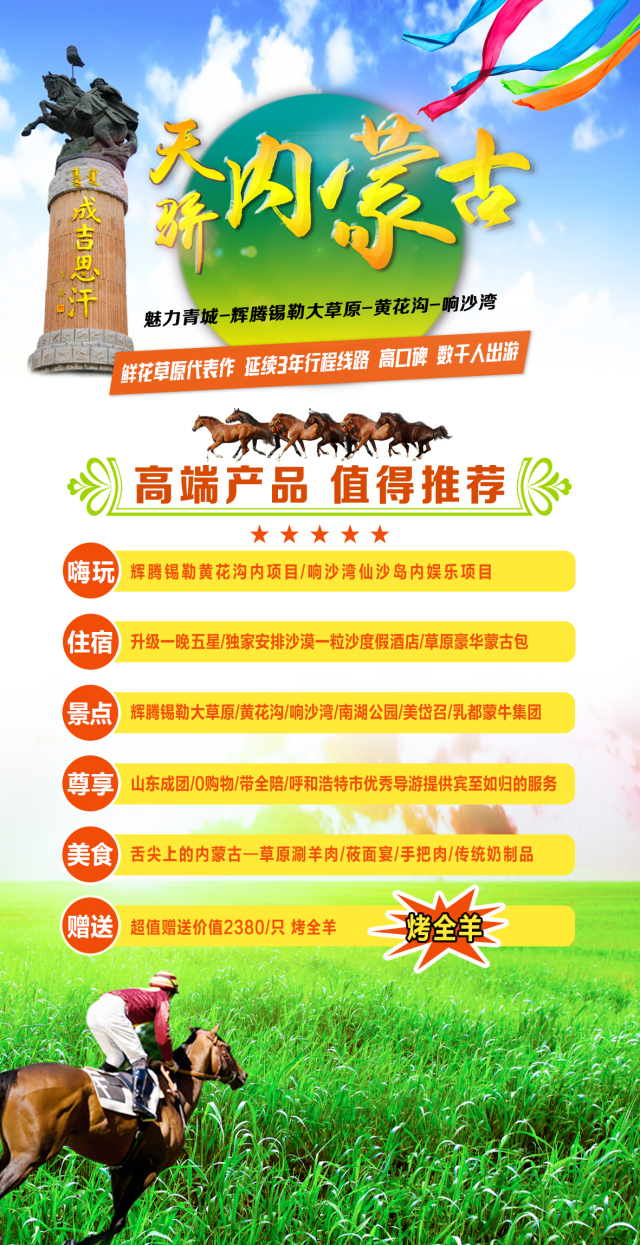 “舌尖上的內蒙古”——烤全羊(2980元/只)、蒙古傳統(tǒng)奶制品、內蒙涮羊肉、特色莜面宴、蒙古族手把肉。