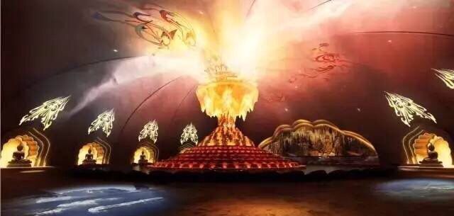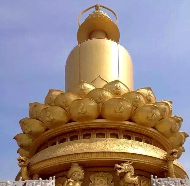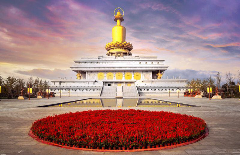 山東省濟寧市兗州區(qū)興隆文化園(大興隆寺)景區(qū)內(nèi),有一座宏偉的靈魂中心建筑——高達118米的靈光寶殿,共分九層。上部金瓶聳然矗立在金蓮花須彌臺上,氣勢雄偉、莊嚴神圣,其中安奉著興隆塔地宮出土的世尊金頂骨真身舍利;下部借鑒了釋迦牟尼壇城的形制,氣勢磅礴象征佛祖的智慧浩瀚無邊與獨特深厚的佛教壇城理念交相輝映。