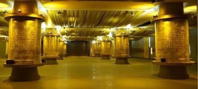 第五層為般若殿,供奉黃財神一尊,韋陀菩薩4尊,八大菩薩4800尊。此層有轉(zhuǎn)經(jīng)輪,屬佛教法器,內(nèi)裝藏經(jīng)文或咒語,順時針轉(zhuǎn)動整圈即等同念誦經(jīng)文或咒語,可以清凈惡業(yè)、積聚功德。
