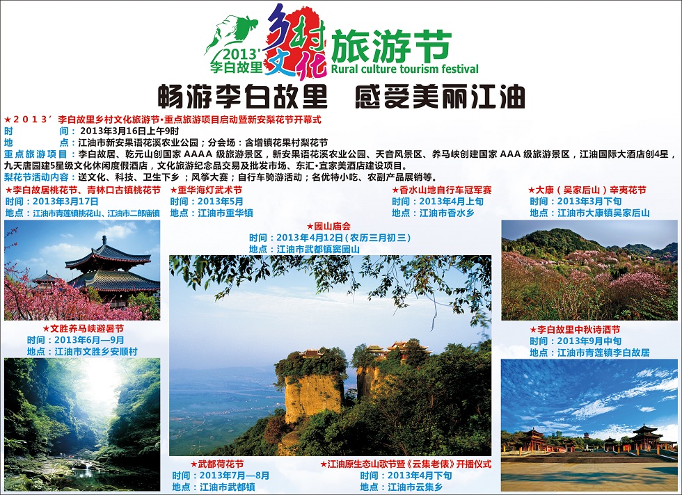 本次鄉(xiāng)村旅游節(jié)從3月16日開始,到12月結(jié)束。除3月舉行的新安梨花節(jié)、青蓮桃花節(jié)外,還將陸續(xù)開展香水鄉(xiāng)山自行車冠軍賽、竇圌山廟會、吳家后山辛夷花節(jié)、江油原生態(tài)山歌節(jié)、武都荷花節(jié)、養(yǎng)馬峽避暑節(jié)、李白故里中秋詩酒節(jié)等活動。期間,還將開展攝影大賽、評選江油十景、名小吃名特產(chǎn)品展銷、水果采摘等30多項活動。